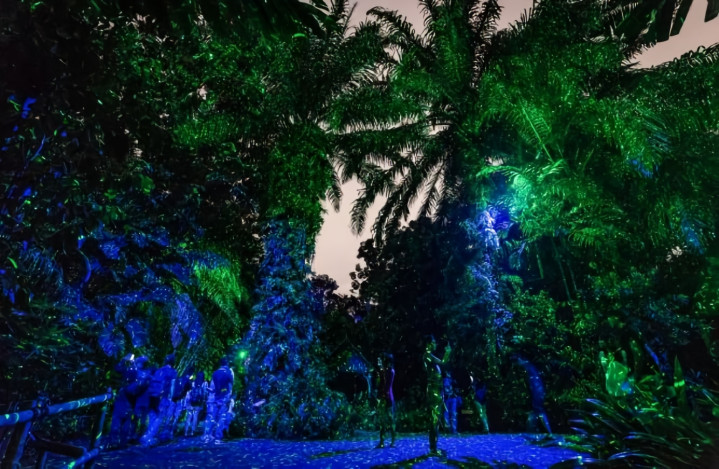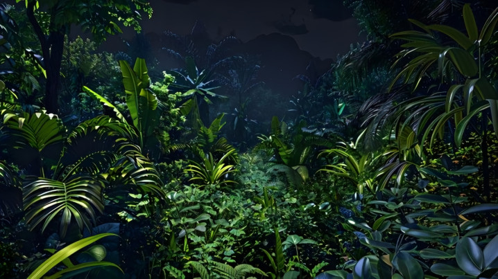 荧光丛林的设计,融合了地球生物的发光特性与科幻想象。地球中的萤火虫、发光水母等生物,通过生物发光实现生存需求,影片将这一特性移植到潘多拉的植物与昆虫上,并放大其发光效果,构建出璀璨的荧光丛林。场景中的植物形态也并非凭空创造,而是融合了地球热带雨林植物的特征——巨大的叶片、缠绕的藤蔓、气生根等,让观众既能感受到外星世界的奇幻,又能找到熟悉的地球生物影子,增强场景的可信度。