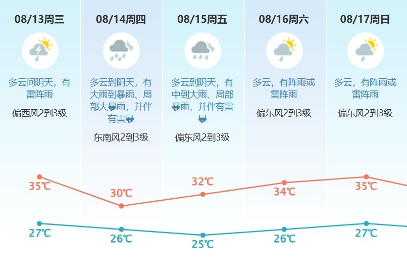 预计我市13日白天多云间阴天,有雷阵雨;13日夜间—15日受台风环流影响,有大雨到暴雨、局部大暴雨,伴有强雷暴和8级左右短时大风,强风雨时段将出现在14日早晨到白天;16—17日转多云,有阵雨或雷阵雨;18日有中雷雨、局部大雨。