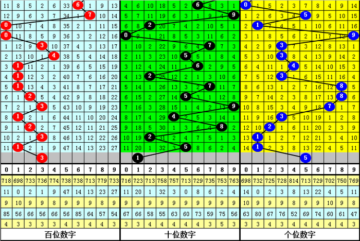 012路分析:最近10周星期四奖号012路总比例为10:11:9,012路号码轮空期数比为1:2:2,上周星期四奖号012路比为0:2:1,本周星期四预计012路号码平衡,参考012路比1:1:1。