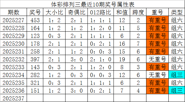体彩排列三最近10期分别开出奖号:453、164、123、178、258、397、143、282、321、151,各奖号属性详见下表: