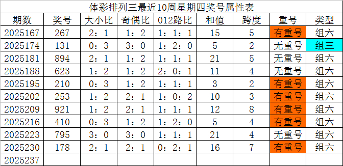 体彩排列三最近10周星期四奖号分别为:267、131、894、623、210、253、921、410、795、178,各奖号属性详见下表: