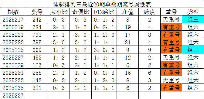 体彩排列三最近20期单数期奖号分别为:242、784、791、795、009、453、123、258、143、321,各期奖号详细属性下表: