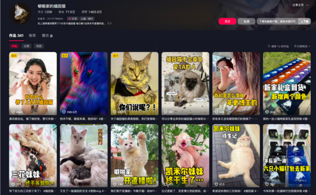 抖音 77.6 万粉丝宠物博主,获赞 1463.9 万,单条视频最高播放 290.5 万。坐拥上海百只规模缅因猫舍,品种涵盖银补丁色、银加白手套色等,以 “日常互动 + 专业科普” 为内容核心,成为铲屎官信赖的知识来源。将带来接地气的养宠经验分享,搭建行业与消费者的沟通桥梁。
